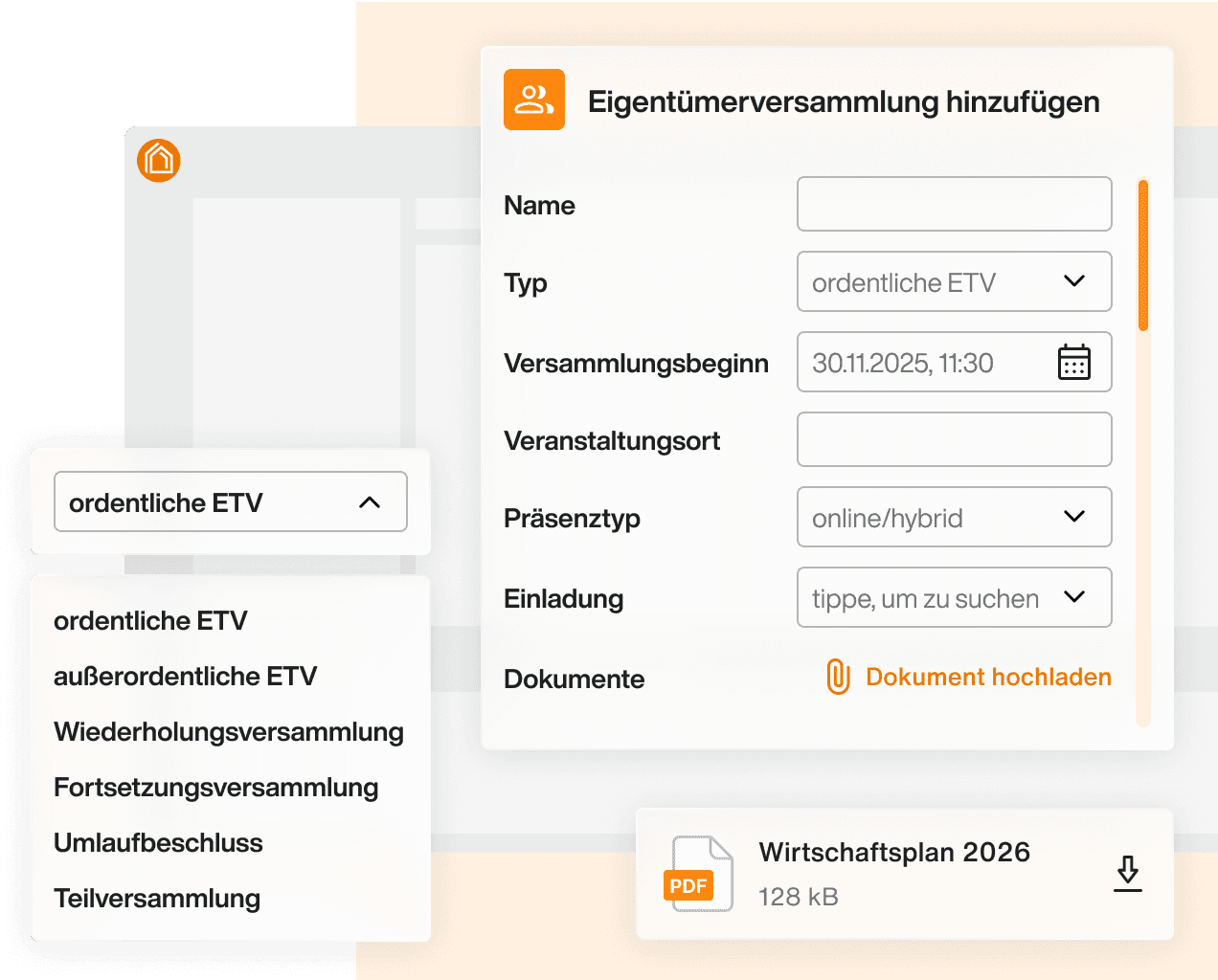 Legen Sie die ETV/den Umlaufbeschluss an, erfassen Sie Grunddaten (Typ, Termin, Ort) und bereiten Sie Einladungen sowie relevante Dokumente vor.