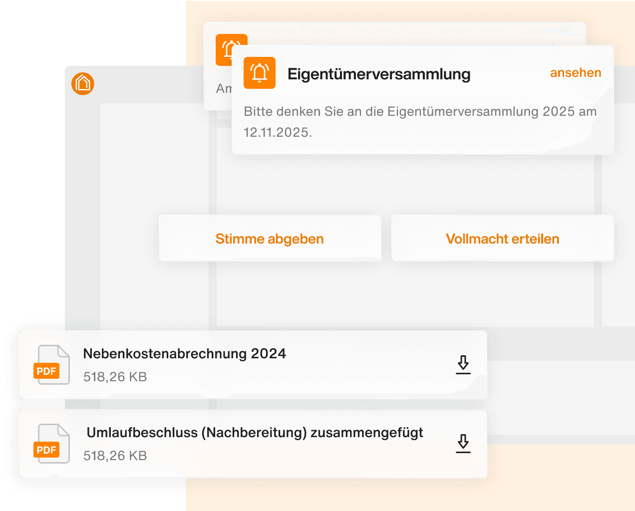 Eigentümer erhalten Einladungen, Dokumente, können teilnehmen, abstimmen und Vollmachten erteilen direkt im Portal.