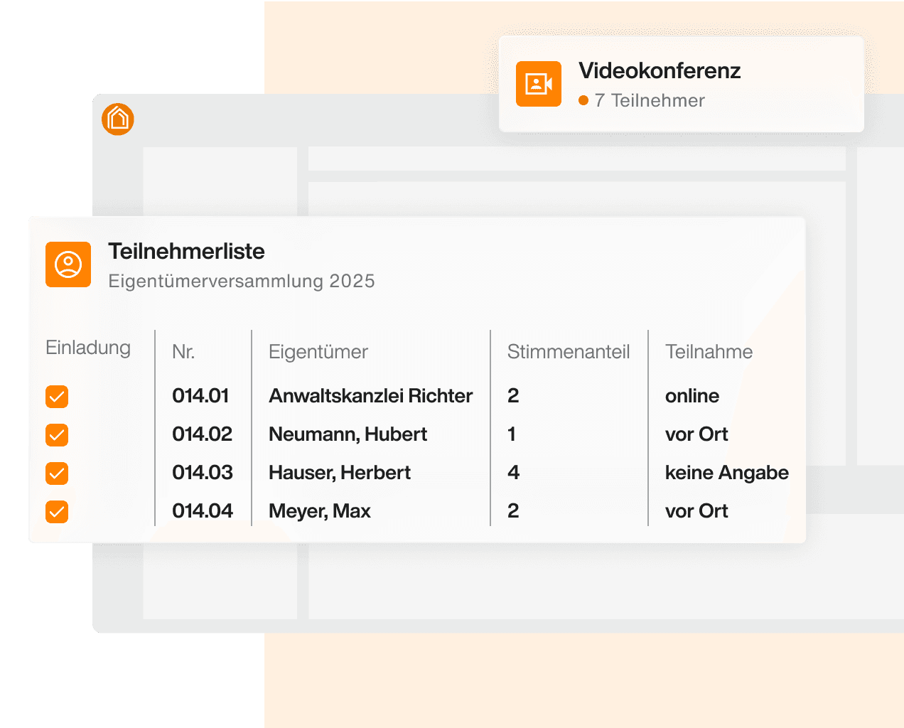 Ermöglichen Sie Präsenz- und Online-Teilnahme (via Videokonferenz-Integration) an Eigentümerversammlungen.