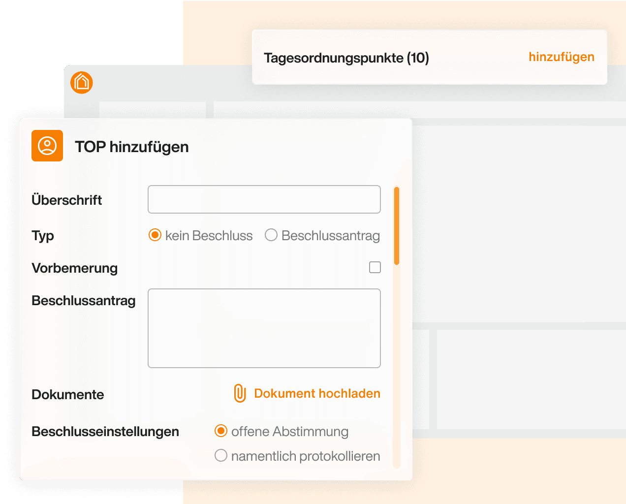 Erstellen und bearbeiten Sie Tagesordnungspunkte, fügen Sie Dokumente hinzu und definieren Sie Beschlussregeln.